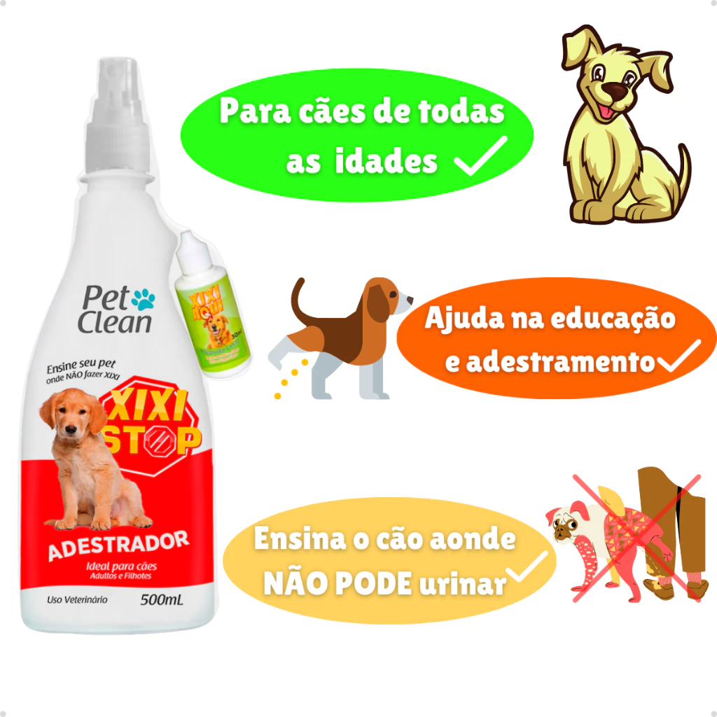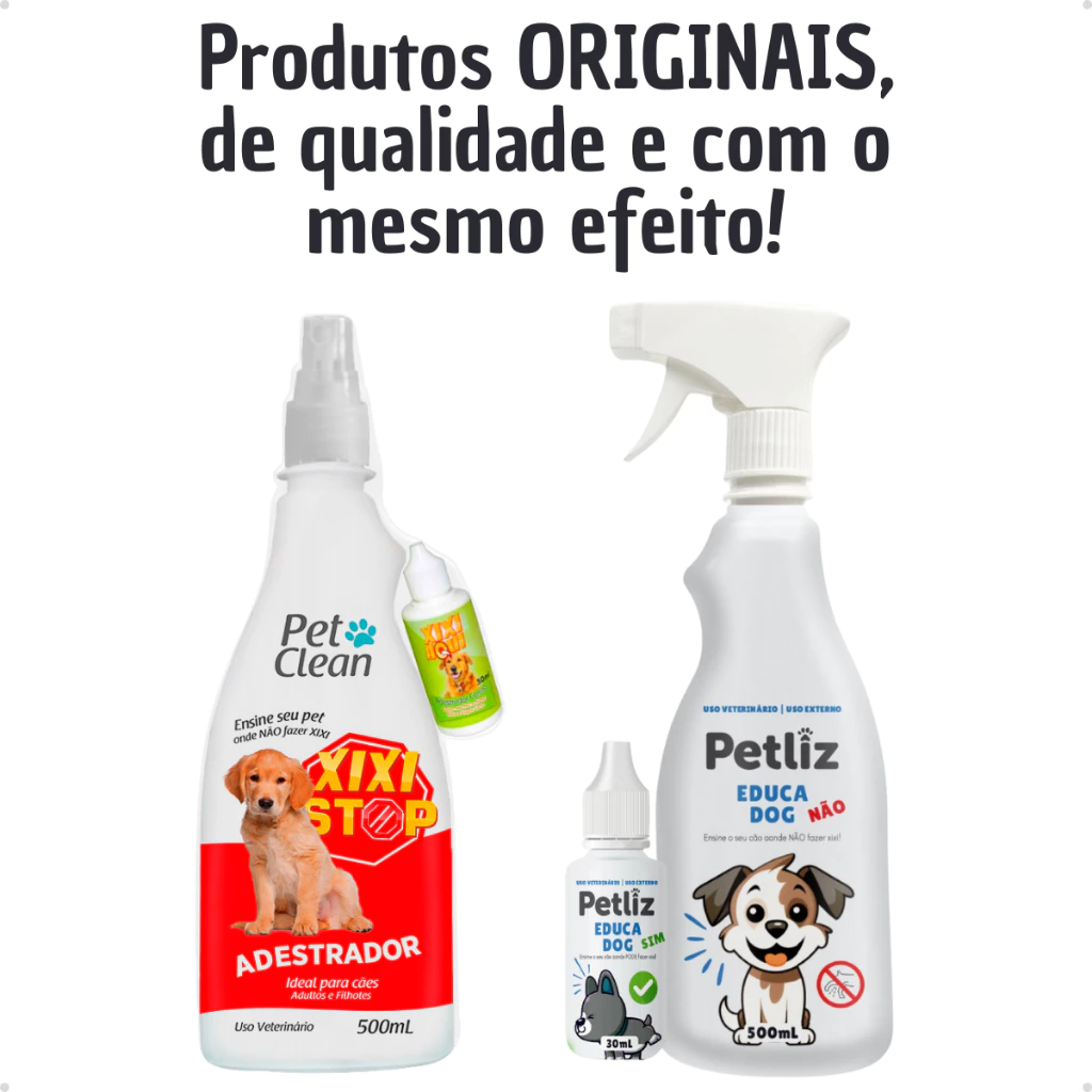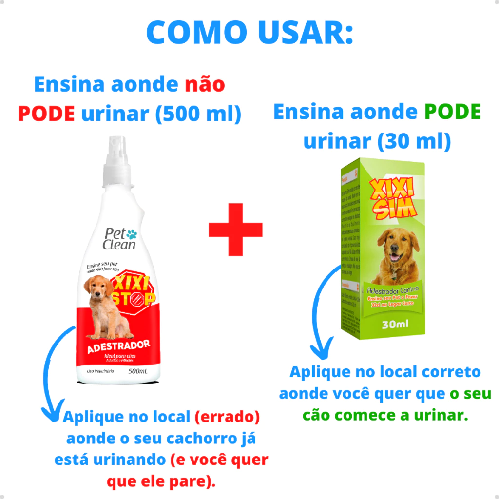 Esse kit foi desenvolvido especialmente para ajudar cães filhotes, adultos e idosos a aprenderem onde devem e onde não devem urinar. O frasco Xixi Não Pode afasta o pet dos locais inadequados, enquanto o Xixi Pode atrai o cachorro exatamente para o ponto correto, facilitando o processo de adestramento mesmo para cães mais teimosos ou acostumados a urinar no local errado.
